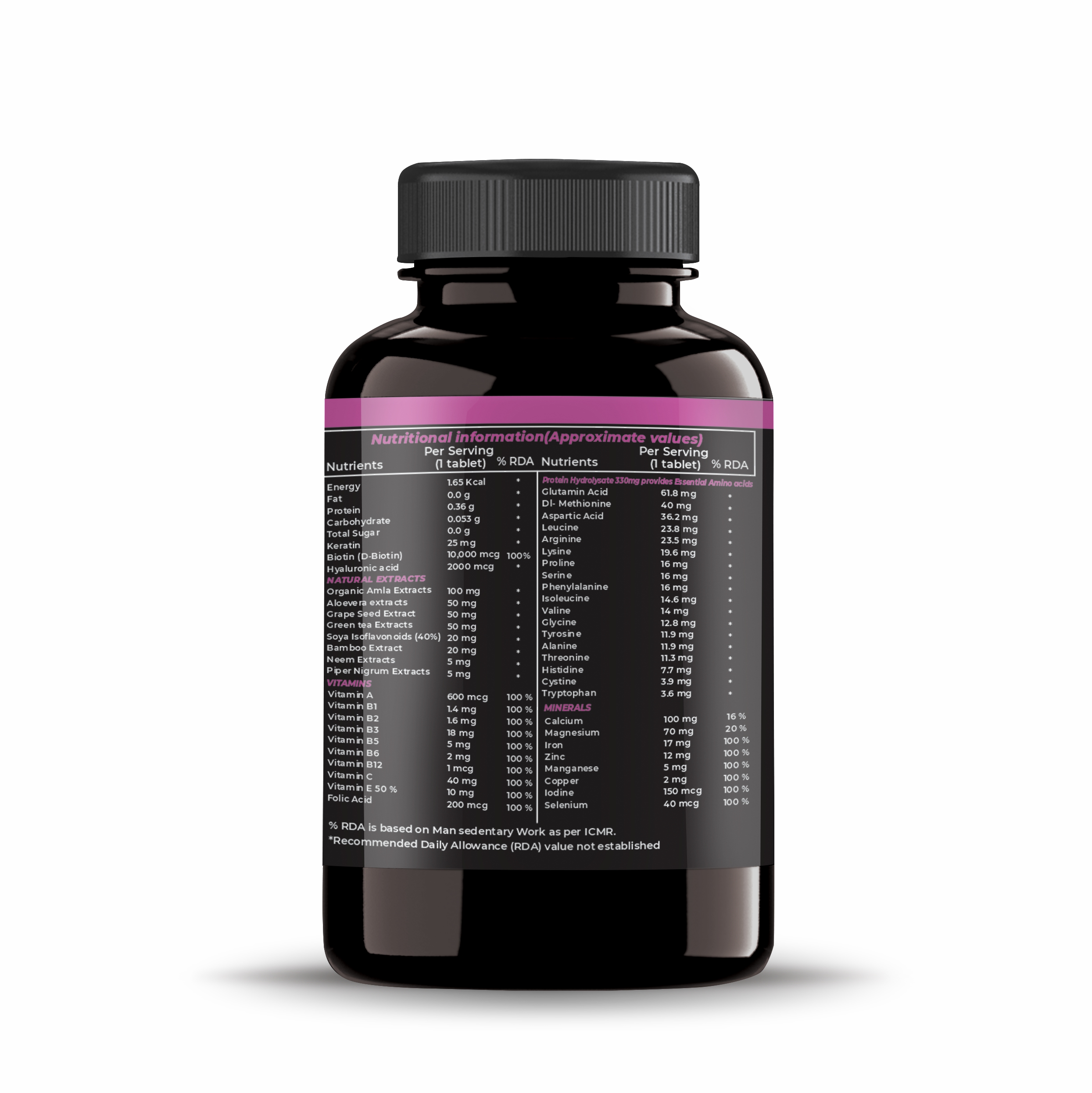 % RDA is based on Man sedentary Work as per ICMR. *Recommended Daily Allowance (RDA) value not established.