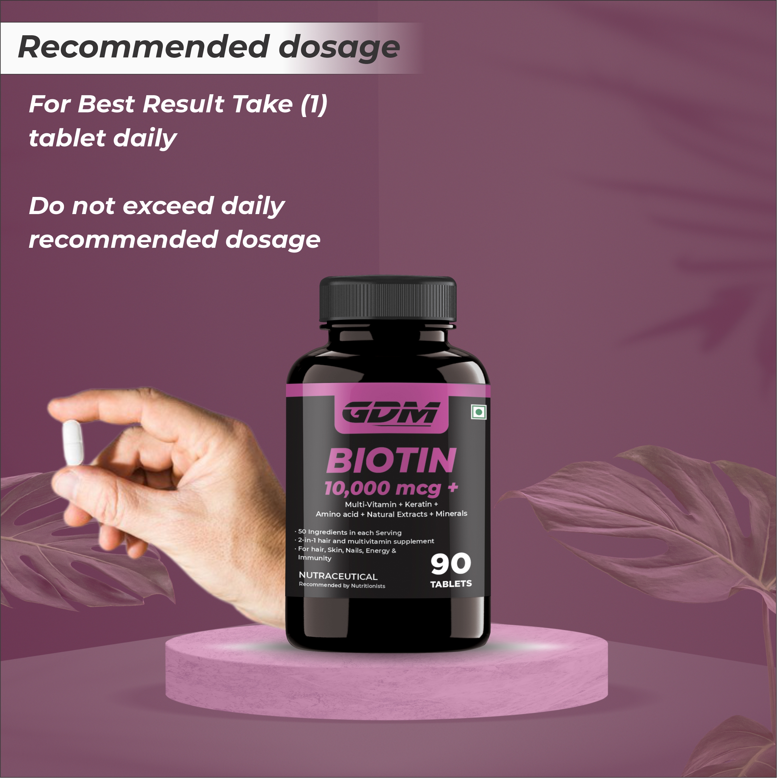 • Each tablet of GDM Biotin contains 10,000mcg of biotin for strong, thick, and shiny hair and nails