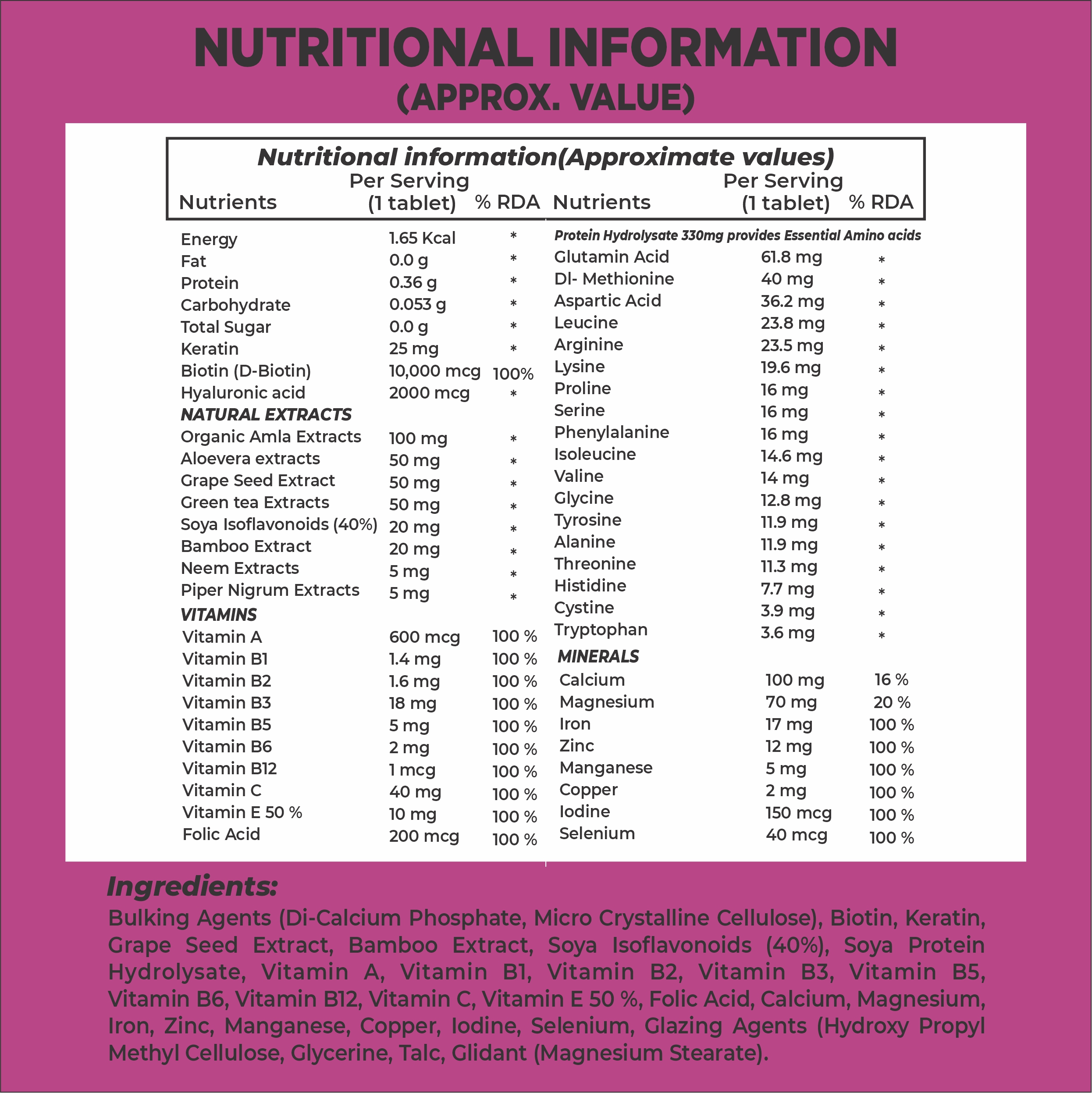NutrientsPer Tablet% RDA