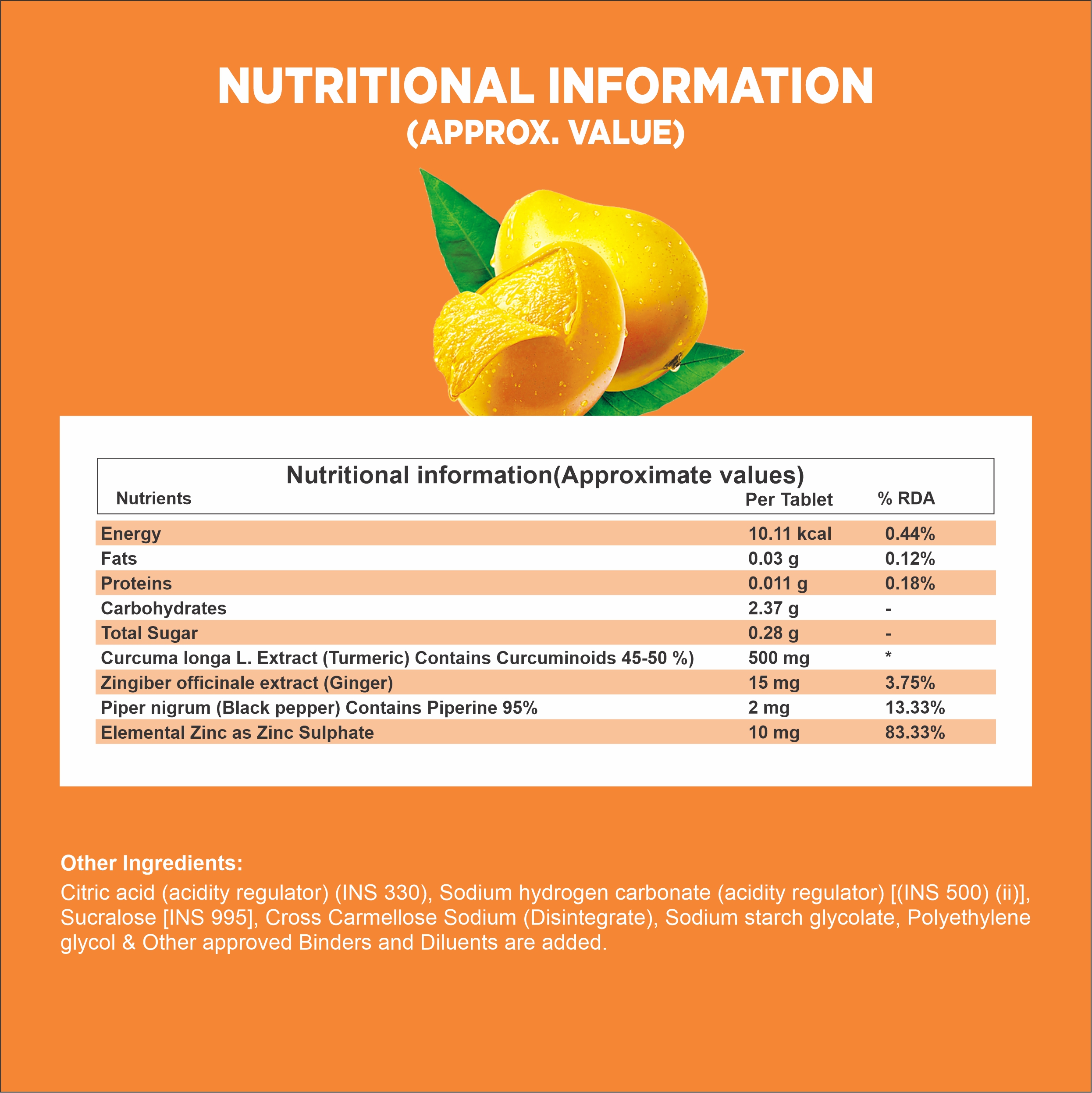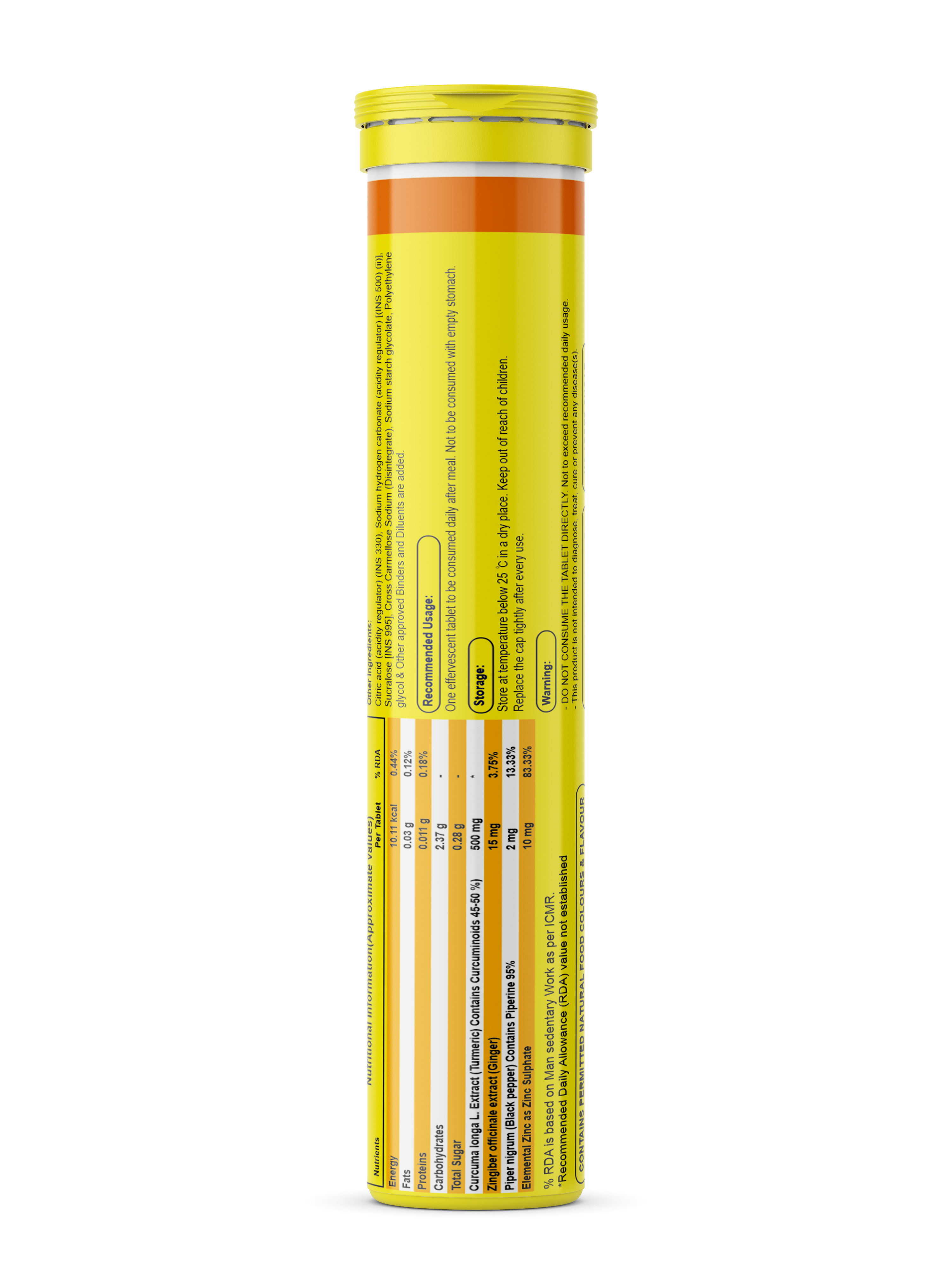 • Curcuma longa Extract (Turmeric), Zingiber officinale extract (Ginger), Piper nigrum (Black pepper), Zinc Sulphate, Citric Acid acidity Regulator, [INS 330]